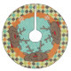 Beautiful Christmas holiday tree skirt features three cute reindeer on a background of brown, cream, aqua, orange, and mustard argyle, a strip of solid orange, and an aqua blue centre with white polka dots and snowflakes.