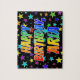 This lively and fun birthday-themed jigsaw puzzle design features the message "HAPPY BIRTHDAY, ARIA" with the characters having a colourful rainbow spectrum inspired gradient pattern, in addition to an exciting stars background pattern. An exciting puzzle like this might be used to send a birthday greeting message to somebody named Aria. [~Z0000468]