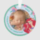 This is a precious, rounded Christmas ornament, perfect for commemorating a baby's milestone holiday season. The ornament features a sweet, personalized baby photo at the center, surrounded by a lovely frame. The design is charmingly accented with Disney's Princess Ariel from The Little Mermaid, complete with flowing red hair and delicate flowers. The edge is inscribed with personalized text marking a First Christmas and the specific year. This stunning piece is a delightful, lasting keepsake to celebrate a baby's first magical Christmas!