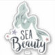Watercolor shape of Ariel sitting amongst starfish with the words "Sea Beauty" written below.