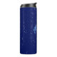 Tumbler in the zodiac sign of Aries in soft silver blue, overlaid with the stars of the constellation, against a starry sky background of deep midnight blue
