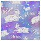 This fun fabric design makes the perfect gift for anyone born under the zodiac sign Aries. It includes a unique pattern made of a vintage ram, the constellation, and the word "Aries," all in white on a purple-pink starry background.