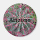 This magnet displays a photo that captures the unique red barrel cactus with its green flesh and long red thorns that layer of overlap to protect this desert plant. "Arizona" appears in the center in black western font and may be customized if you desire.
