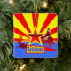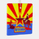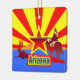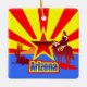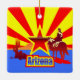 A country style vector drawing in red, yellow, and blue, featuring a cowboy riding a horse in the hot desert and the Arizona State flag as a background.