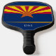 The front of this pickleball paddle shows an image of a the Arizona state flag, in the customary colours of red, gold, orange and blue. The image is placed on a black background with borders of matching stripes. Your monogram is at the bottom. *Note - this is an upcharge for printing the design on the back; if you would like to do this, you may copy and paste the front image to the back by using the Design Tool. If you need assistance, just shoot us an e-mail; we are always happy to help!
