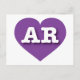 This postcard features a vibrant purple heart containing the bold, white, upper case letters AR, the official abbreviation for Arkansas, the natural state. The reverse side of the postcard is blank, awaiting your handwritten sentiments or customized text.