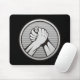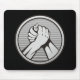Silver round medal with two hands in arm wrestling. Custom background colour. Custom text.
