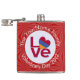 An Armenian LOVE FLAG on a personalized hip flask. It features the word LOVE showing in red letters inside a white, fractal circle of squiggly squares. The circle sits on a red, fractal, squiggly square background. Perfect for Valentine's Day or any special occasion.