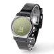 Army green olive geometric mesh pattern Monogram Wrist Watch. Monogrammed Personalized gift watch accessory for him with your custom initial and name. Army green olive gradient geometric mesh pattern. Army green gradient geometric mesh pattern triangles ombre. Army green dark olive hue for soldier gear, camo. It mimics natural military landscapes, toughness, endurance, resilience. Earthy undertones connect to nature, grounding. Symbolizes military legacy, outdoor utility.