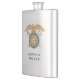 The product is a good size and came exactly as it was pictured. The lid is not attached to the flask, which could be dangerous on drunken nights... The print came out surprisingly well and looks very sharp. Would definitely recommend.