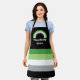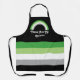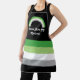Women's apron with an image of an aromantic pride flag and a rainbow; green, white, grey, and black design on a black background, with a customizable text template for your own name or message