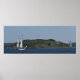 A colour panoramic photographic image of a tall ship taking an afternoon cruise near McNab's Island in Halifax Harbour. A highlight of the island is the lighthouse. Halifax is the capital city of the Atlantic Canadian province of Nova Scotia which is located on the east coast of the North American country of Canada