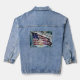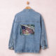 Cette image américaine, drapeau, est mise en évidence contre, feux d'artifice éclatant, dans un affichage coloré de, rouge, blanc, bleu et jaune, fusées-dans un ciel nuageux, crépusculaire, de bleu ardoise.