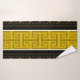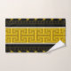 Cette serviette de bain est composée de formes de lignes de méandre de la Key grecque, très proches, sur un arrière - plan de toile noir et chaud de couleur jaune moutarde, avec une superposition verticale à deux lignes blanches et fines qui produit une interaction de contraste étonnante.