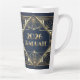 This elegant design features the text "2026 GRADUATE" in a classic, metallic gold serif font positioned in the center. The text is framed by a highly detailed, symmetrical Art Deco border inspired by the 1920s and the "Great Gatsby" aesthetic. The frame consists of sharp geometric lines, overlapping diamond shapes, and stylized sunburst or fan motifs in gleaming gold. The background is a deep, rich navy blue with a very subtle, faint geometric pattern, providing a luxurious contrast that makes the gold elements pop. The overall aesthetic is sophisticated, vintage, formal, and glamorous
