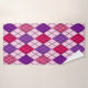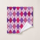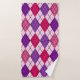 This towel set has an art deco design of diamond shapes made from overlapping angles in black lines coloured in shades of purple and pink with diagonal black lines making the design look like argyle