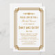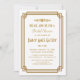These bridal shower invitations feature a white and gold colour palette, a geometric frame, and other stylistic details all inspired by Art Deco and the roaring twenties. You can customize the sample text fields to your liking.