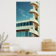 A blue sky behind an art deco building with a spiral stiarcase and lots of windows.