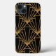 This phone case has an Art Deco design of diamonds and triangles in gold on a field of black.
