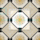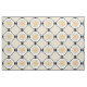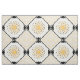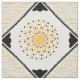The original pattern on this custom-made fabric was created by digital artist, Leslie Sigal Javorek & inspired by 1920's Art Deco. On an off-white backdrop, the central medallion of the repeating pattern is a bright sunflower yellow stylized sunburst w/sharp angled rays. Black photo corners surrounded by a black guitar pick chain border is set on point, and in each of the 4 corners are blocks of several fine black lines alternating direction & separated by horizontal yellow sun rays.