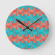 This clock has an art deco design of two-toned orange and teal circles inside two-toned orange and teal triangles.
