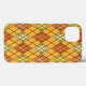 This phone case has an art deco design of diamond shapes made from overlapping angles in black lines coloured in shades of orange and yellow with diagonal black lines making the design look like argyle