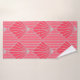 This towel set has an art deco design of diamonds and lines in silver on a field of pink.