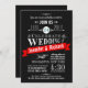 Invitations noires et blanches attirantes de fête et lunatiques de mariage avec une bannière rouge audacieuse. Typographie vintage élégante de craie de rétro-style avec un motif semi-formel d'art déco. Perfectionnez pour des mariages modernes à la mode avec un contact sophistiqué de classe pour les jeunes mariés traditionnels. Veuillez nous contacter pour l'aide avec la personnalisation si vous avez besoin de la pièce supplémentaire pour vos détails de mariage.