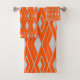 This towel set has an art deco design of grey diamond shapes on a field of orange.
