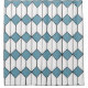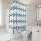This shower curtain has an art deco design of white hexagons with a black line down the middle and blue diamonds.