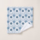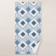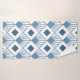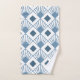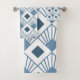 This towel set has an art deco design of dusty blue diamonds with diagonal lines and dark blue diamonds on a field of white.