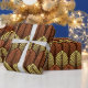 Wrapping paper in a vintage Art Deco wallpaper pattern based on a stylized feather - rust brown and light chamois yellow, on a dark chocolate brown background