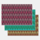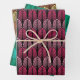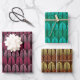 Wrapping paper in a vintage Art Deco wallpaper pattern based on a stylized feather - deep fuchsia pink and soft pink, on a black background, aqua and turquoise / peacock, on a deep teal background, and rust brown and light chamois yellow, on a dark chocolate brown background