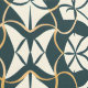 This artwork features an intricate pattern inspired by Art Deco design, characterized by flowing, symmetrical lines and geometric shapes. The design is rendered in a refined palette of deep teal, cream, and subtle gold accents, creating a sophisticated and elegant look. The repeating motifs form a complex, interwoven pattern that exudes both harmony and movement. The combination of curves and sharp angles adds a dynamic quality to the design, while the colour scheme maintains a sense of timelessness and classic style.