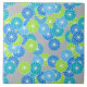 An Art Deco pattern based on a traditional, stylized chrysanthemum pattern used in Japanese textiles, in shades of blue, turquoise and lime green, outlined in white, on a light, silver grey background