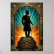 A classic portrait of Jazz Age sophistication and mystery. This striking artwork features a black silhouette of a gentleman in a top hat and formal coat, holding a cane while standing confidently upon a tiered Art Deco pedestal. Framed by a radiant golden sunburst that transitions into a deep teal archway, this piece captures the timeless glamour of a 1920s evening. Perfect for a modern office, home bar, or as a statement piece in a minimalist interior.