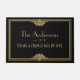 This beautiful design combines straight lines and triangles to make this interesting black and gold Art Deco style door mat. Dress up the entry to your home with this elegant doormat design from Night and Day Designs. Personalization includes family name and year established. Includes a quote that reads "You are a stranger here but once." All of the text is done in Art deco type styles.