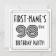 The front of this Roaring Twenties inspired ninety-eighth birthday party invitation card design features a customizable name, a fancy art deco look inspired number “98th”, the message “BIRTHDAY PARTY!”, and a border pattern consisting of lines. The back features personalized details about the event, such as the date, time, place/venue, and any other important information. Stylish, luxurious, customizable invitations like these might be used to invite attendees/guests to a birthday gathering/party being held to celebrate somebody’s 98th birthday. [~Z0000614]