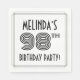 This elegant and Roaring Twenties inspired ninety-eighth birthday celebration paper napkin design features a personalized name, a fancy art deco style inspired number “98th”, the message “BIRTHDAY PARTY!”, and a border pattern consisting of lines. Birthday themed paper napkins like these might be used at a party celebrating somebody’s 98th birthday. [~Z0000613]