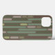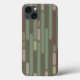 This phone case has an art deco inspired design made of long ovals filled with solid colour or lines in a camouflage colour palette.