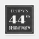 This 1920s-1930s style inspired forty-fourth birthday party paper napkin design features a customizable name, an intricate art deco look inspired number “44th”, the message “BIRTHDAY PARTY!”, and a border pattern consisting of lines. The background is coloured black by default, but it can be customized to a different colour, if desired. Birthday themed paper napkins like these might be used at a birthday party celebrating somebody’s forty fourth birthday. [~Z0000612]