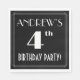 This 1920s/1930s style inspired fourth birthday party paper napkin design features a customizable name, an intricate art deco look inspired number “4th”, the message “BIRTHDAY PARTY!”, and a border pattern consisting of lines. The background is coloured black by default, but it can be customized to a different colour, if desired. Paper napkins like these might be used when celebrating somebody’s 4th birthday. [~Z0000612]