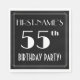 This stylish fifty-fifth birthday celebration paper napkin design features an editable name, a fancy art deco look inspired number “55th”, the message “BIRTHDAY PARTY!”, and a multi-line border. There is a black-coloured background by default, but it can be customized to a different colour, if desired. Paper napkins like these might be used at a birthday party for somebody who is celebrating their 55th birthday. [~Z0000612]