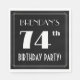 This Roaring Twenties inspired seventy-fourth birthday celebration paper napkin design features a customizable name, a fancy art deco look inspired number “74th”, the message “BIRTHDAY PARTY!”, and a multi-line border. It has a black-colored background by default, but it can be customized to a different color, if desired. Paper napkins like these might be used when celebrating somebody’s 74th birthday. [~Z0000612]