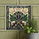 Art Deco Lotus Floral Navy Blue Gold Green Pattern Tile