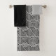 This towel set has a grey washcloth, a black hand towel, and an Art Deco design made from a right angle with a maze set inside in black on a field of grey.