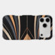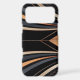 This abstract Art Deco design exudes luxury and sophistication with its sweeping metallic arcs in gold, copper, and grey against a deep black background. Symmetrical curves converge towards a central focal point, framed by sharp angular lines and vertical patterns, evoking glamour and retro elegance. Perfect for elevating home decor, office art, and stylish accessories with a timeless, opulent aesthetic.