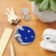 Classic Art Deco moon and stars design in brushed metallic silver, with an enamel look, deep cobalt blue background