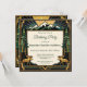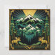 This bold birthday party design features a striking Art Deco mountain landscape framed by geometric borders in deep green, navy, and gold tones. Snow capped peaks rise beneath radiant sunburst lines, while tall evergreen trees create a symmetrical forest setting. Two stylized moose stand at the base, adding a distinctive wilderness touch to the composition. The central cream panel highlights elegant script lettering for Birthday Party, paired with clean modern typography for the event details. With its structured lines and rich color palette, this artwork blends vintage glamour with rugged outdoor charm for a sophisticated woodland celebration.