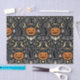 A dramatic Art Deco–inspired Halloween repeating pattern set against a deep black background, featuring sleek, stylized black cats with glowing green eyes arranged in a bold, symmetrical rhythm. Classic Halloween motifs—jack-o’-lanterns, crescent moons, bats, spiders, spiderwebs, witches’ hats, and sparkling geometric stars—are rendered in refined Deco forms with clean lines and elegant contrast. A limited palette of inky black, warm pumpkin orange, champagne gold, and soft ivory creates a glamourous, nocturnal mood that feels luxurious and sophisticated rather than playful.